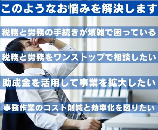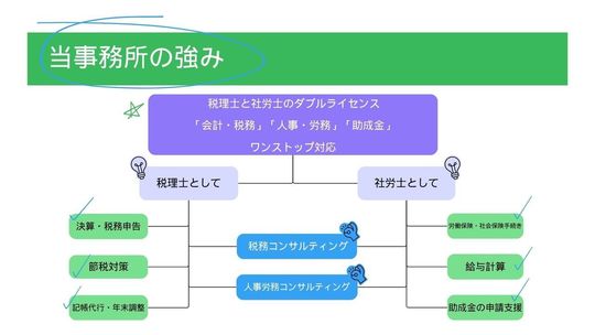 当事務所の強みは、税務・労務・助成金のトータルサポートを提供し、同時に対応することで、お客様の負担を軽減し、事業の成長をサポートします。